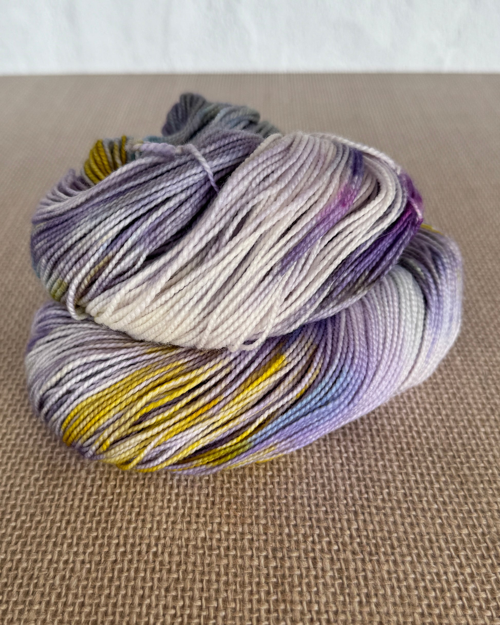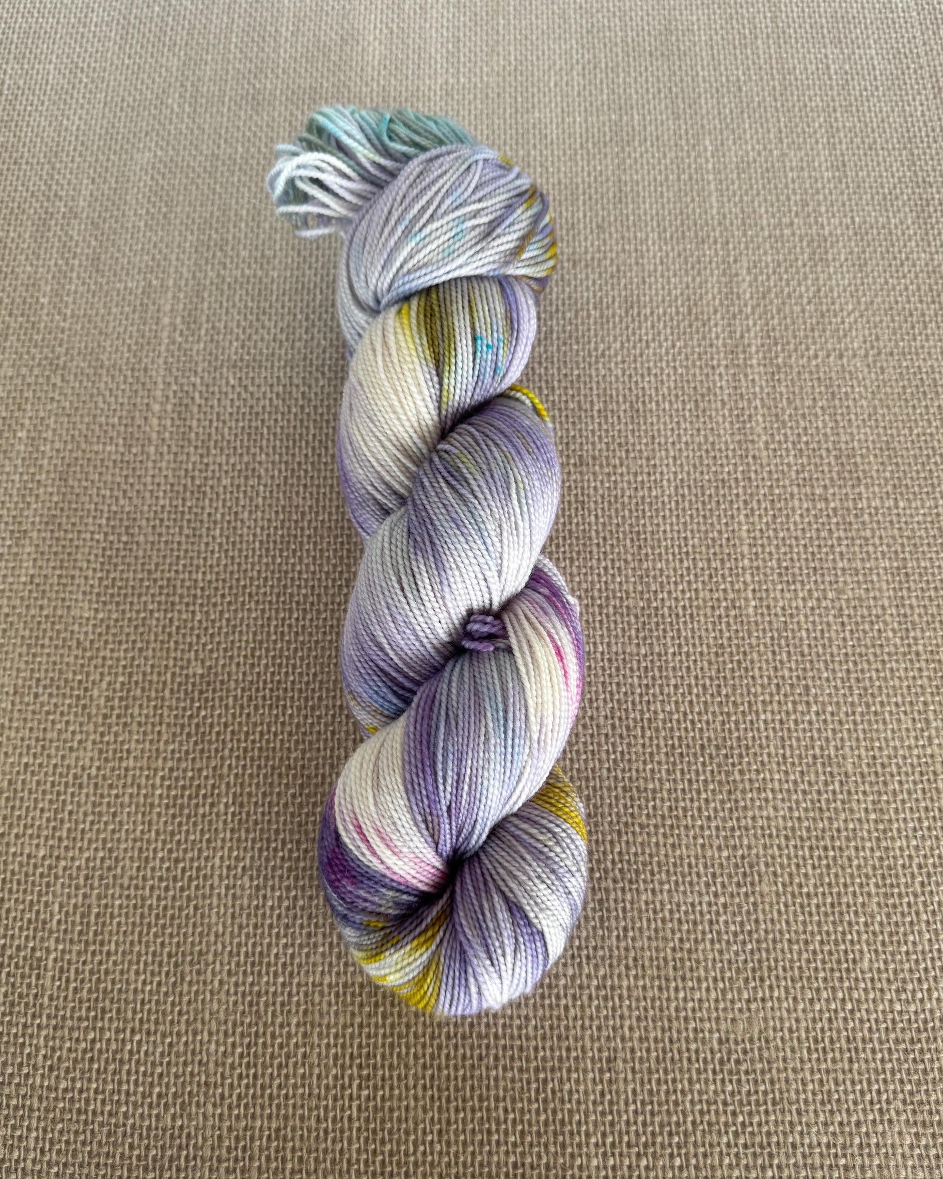 Soft lilac, butter yellow, and sky blue swirl gently across a pale cloud base — a pastel daydream captured in yarn. Light and airy with just a touch of whimsy, this colorway feels like a quiet morning under sun-washed sheets.