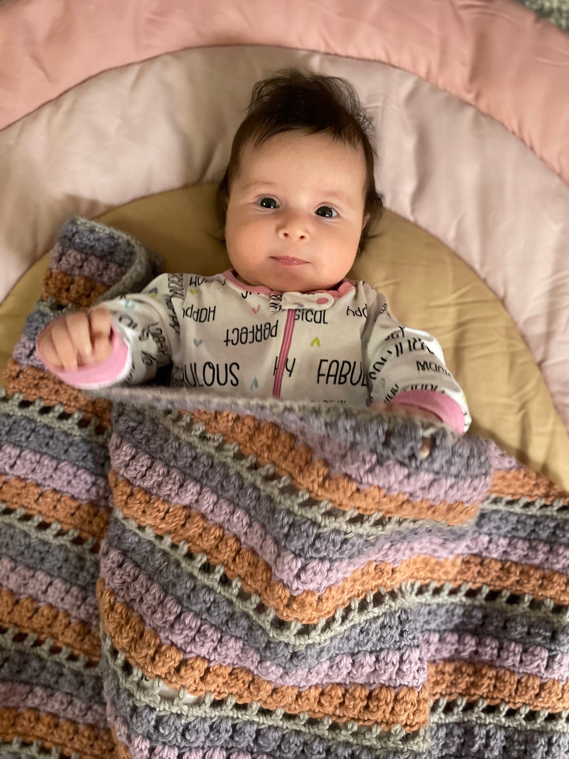 Lullaby is the first design I worked on after my baby was born. I made the larger lap blanket size to cover both of us while we snuggle on the couch. If you’re not a fan of changing colors every two rows, this blanket can easily be worked in a single color. Or go with a two-color option and work the 6 rows of cluster stitches in one color Rows 1-6) and the double crochet mesh (Rows 7-8) in a contrast.