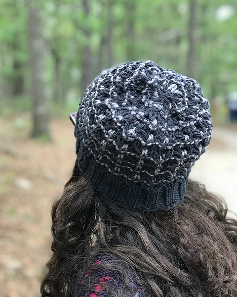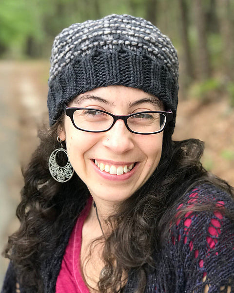 This semi slouch hat works up quickly in bulky weight yarn. The color patterning is formed with striped and slipped stitches. You will only be wordking with one color at a time.