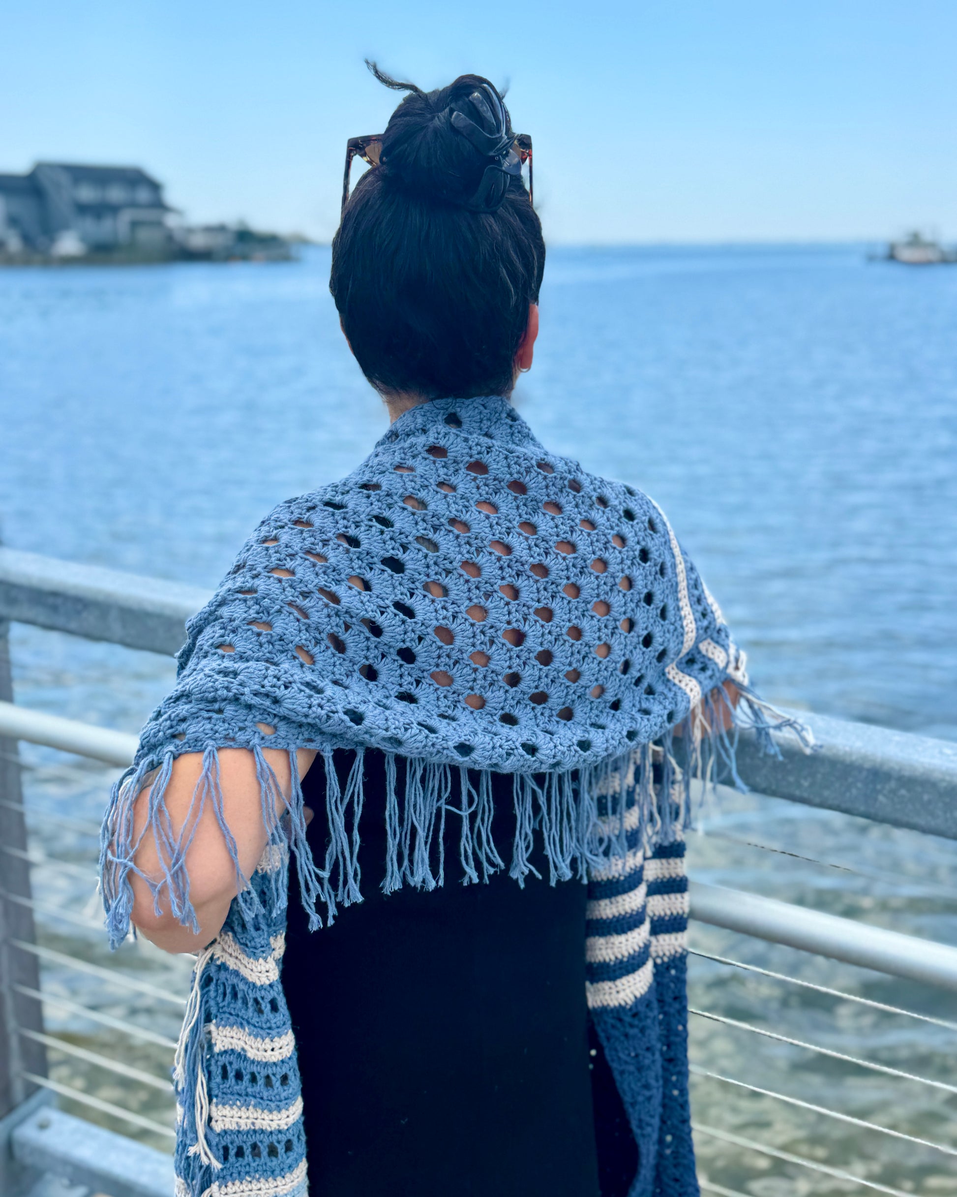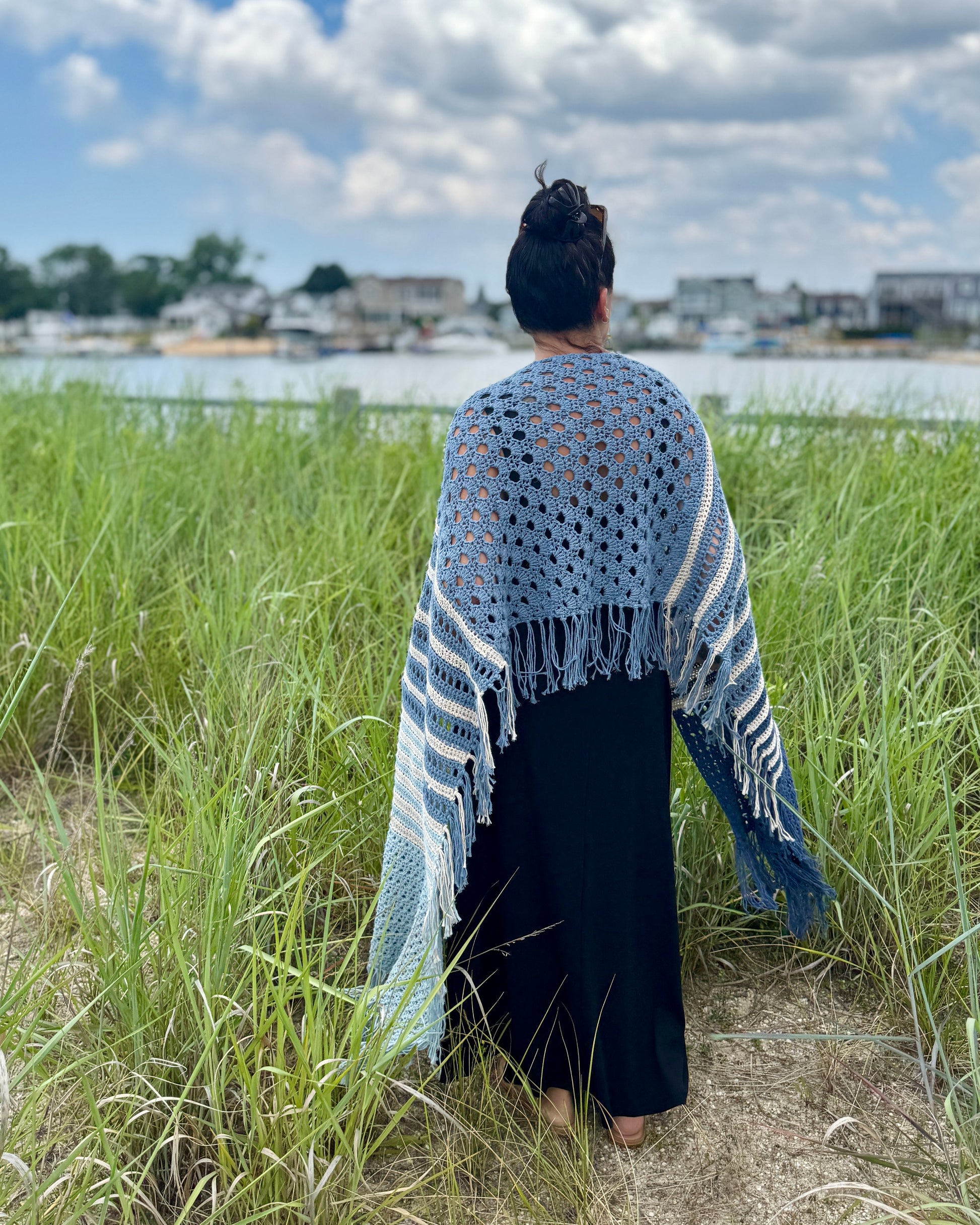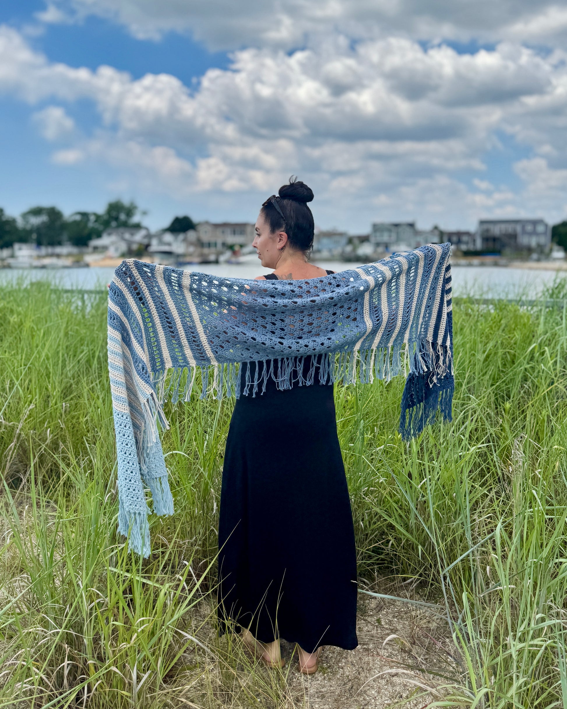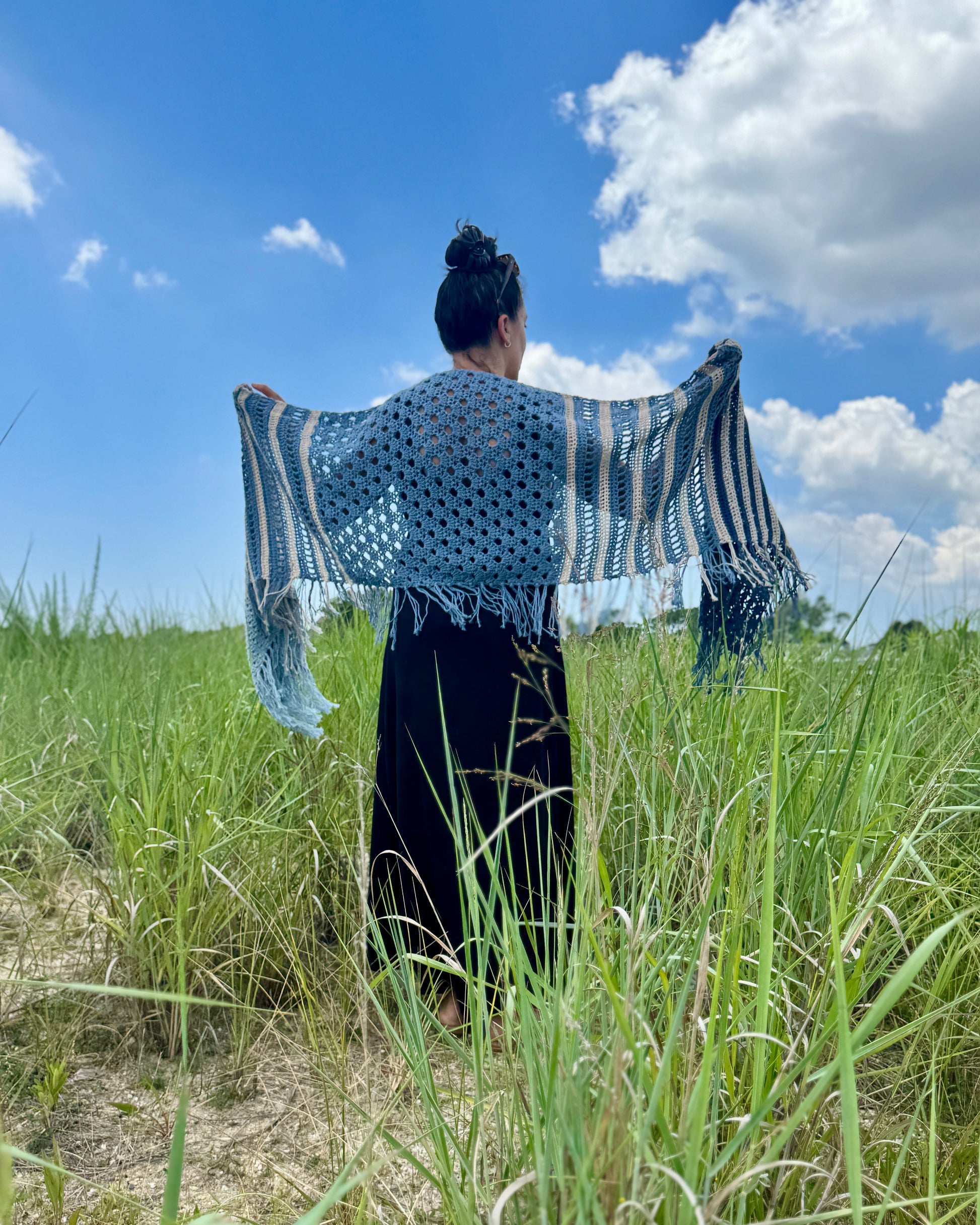 Crafted with Lion Brand’s Cotton Hemp yarn, the wrap features a breathable worsted-weight texture with a soft, natural hand. The color palette—Husk, Aero, Neptune, and Deep Denim—fades gently from light to dark in a serene ombré reminiscent of seaf and sky. Optional fringe along three edges adds a bit of whimsy and movement to the finished piece.
